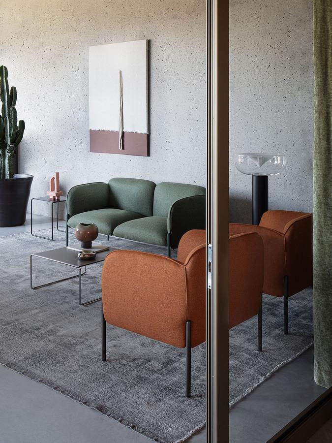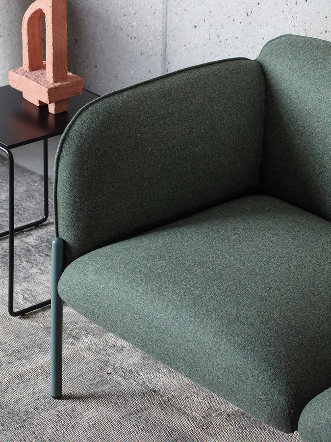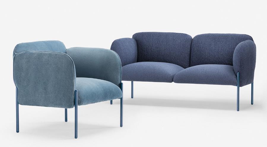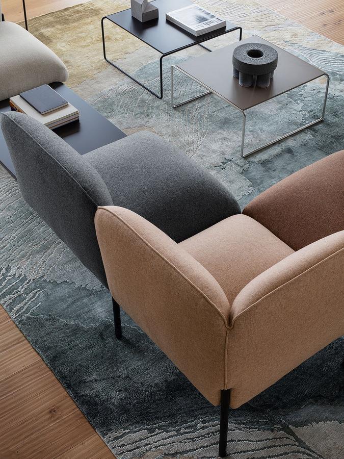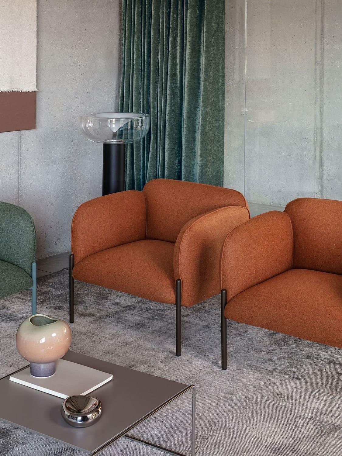 Frida di Matteo Zorzenoni è un sistema modulare dalle forme morbide e armoniose, con cui si progettano poltroncine e divanetti. Il dettaglio del cordolo, cucito tono su tono con il rivestimento, ne definisce la silhouette, con una cura che ricorda quella degli imbottiti domestici. Le gambe metalliche, disponibili in una varietà di colori, si innestano nei braccioli, esaltandone il design raffinato.